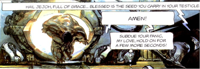 I mean, dude, there’s comic book logic and there’s Metabarons logic. Whereas Marvel and DC have repeatedly killed off and brought heroes back in increasingly strange ways, Jodorowsky just shrugged and typed: baby’s head explodes, mad witch mama grafts it onto robot slave. Problem solved!